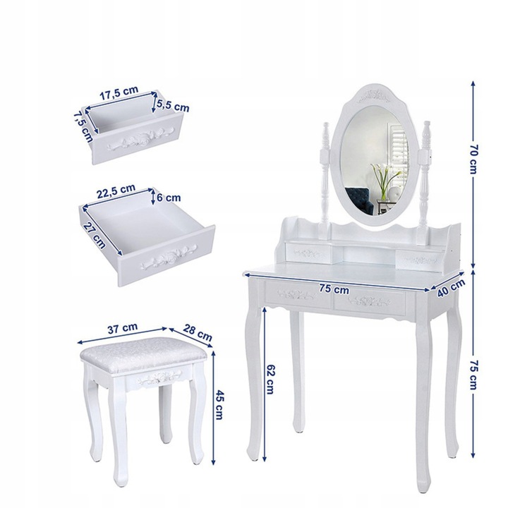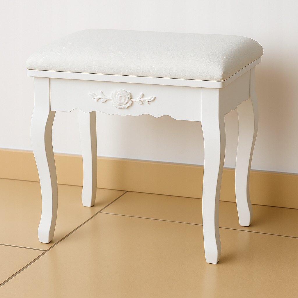 Комплект включає зручний стілець , стилізований під умивальник. М'яке сидіння забезпечує комфорт навіть під час тривалого укладання або нанесення макіяжу, а стабільна, міцна конструкція гарантує безпечне та комфортне використання . Закруглені ніжки повторюють романтичний дизайн умивальника, створюючи елегантний, гармонійний гарнітур, який чудово виглядає в будь-якому інтер'єрі.