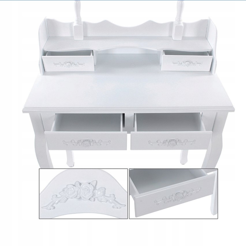 КОСМЕТИЧНИЙ ТУАЛЕТНИЙ СТОЛИК З ДЗЕРКАЛОМ, 4 ШУХЛЯДИ, БІЛИЙ + СТІЛЬЧИК ДЛЯ МАКІЯЖУ